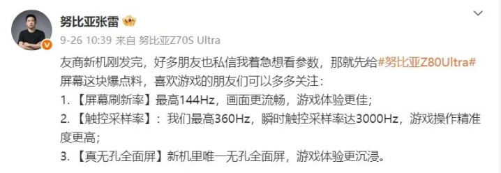 努比亚旗舰产品总经理张雷预告,努比亚Z80 Ultra即将登场,依然采用真无孔全面屏形态,新品将在10月正式亮相。