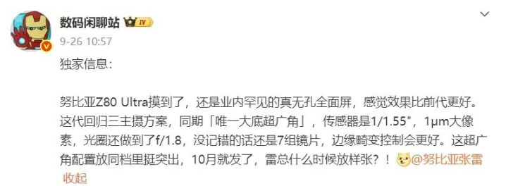 博主@数码闲聊站 爆料,努比亚Z80 Ultra的真无孔全面屏在行业内罕见,效果比前代更好,而且这代回归三主摄方案,配备唯一大底超广角,传感器尺寸是1/1.55",拥有1μm大像素,光圈还做到了f/1.8,边缘畸变控制会更好,同档表现突出。