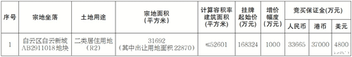 11月18日,广州日报刊登了白云新城AB2911018地块的出让公告。地块为二类居住用地,宗地面积31692㎡,计容建面52601㎡。挂牌起始价为168324万元,折合楼面价约3.2万元/㎡。