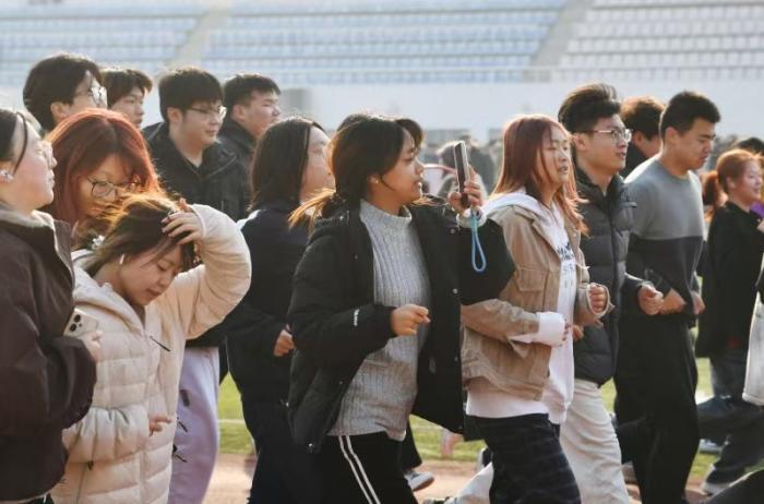 师生们在跑前热身。当天,《北京建筑大学促进学生身心健康行动方案(2026-2029年)》正式发布。