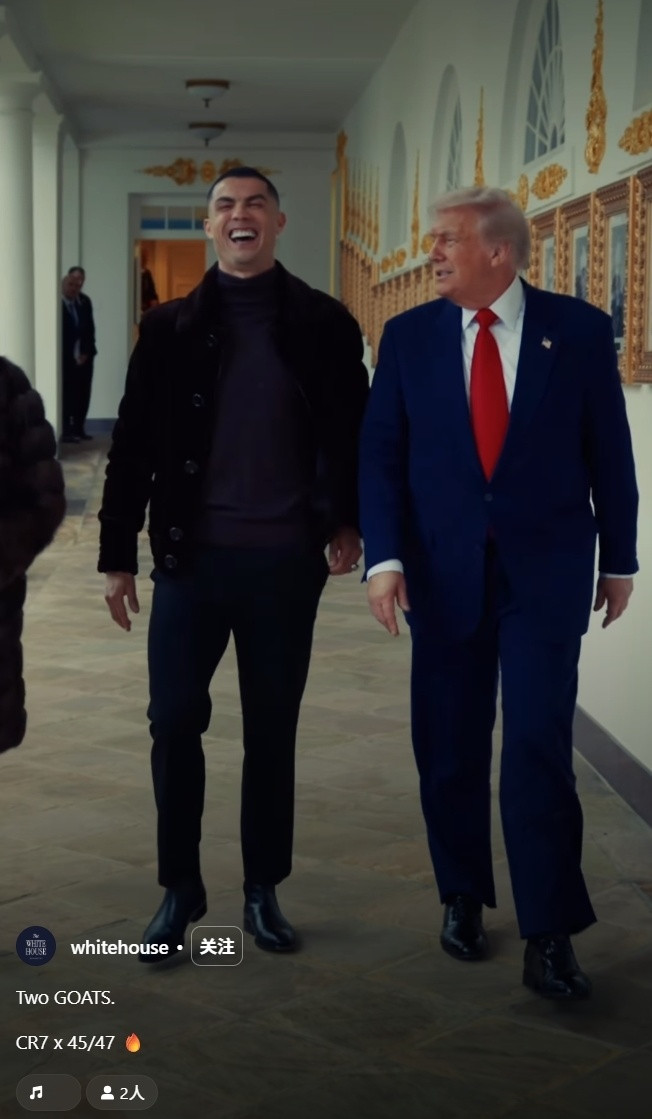 北京时间11月19日晚,白宫和C罗官方账号联合发布社媒,晒出了一段C罗与美国总统特朗普一同在走廊散步的片段配资界,并且配文:“Two GOATS(两个历史上的最佳)”。