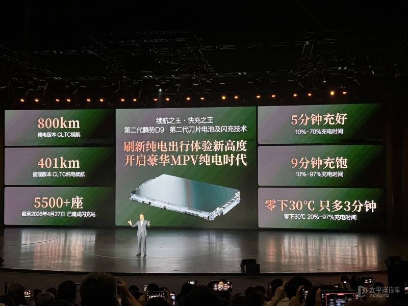 据介绍,第二代腾势D9是全球首款搭载第二代刀片电池及闪充技术的豪华MPV,纯电版CLTC续航达800km,插混版纯电续航401km、综合续航1520km,可覆盖日常通勤与长途出行场景。其闪充系统支持快速补能,低温环境下充电效率保持稳定,能有效缓解新能源车型补能焦虑。